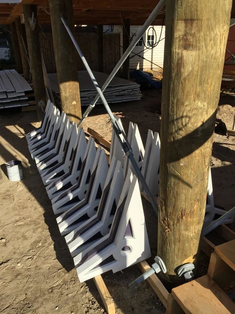 While working for J. D. Neal, I designed and modeled a cornice for a house under construction. The design is made up of three pieces, with the two outer pieces containing a CNC routed design. The circle part of the design was routed at two different angles.